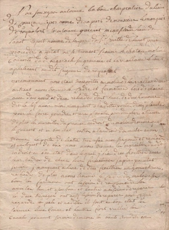 « Nous soussignés Antoine Babou charpentier du lieu de Couiza expert nommé de sa part de Monsieur le marquis de Roquefort et Antoine Gaichet menuisier du lieu de Lanet expert nommé de la part du sieur Barthe de Lanet pour procéder à l’estat où se trouvent savoir le château moulin couverts dudit Bugarach Sougrainnie et La Viallasse le tout appartenant audit seigneur de Roquefort.
