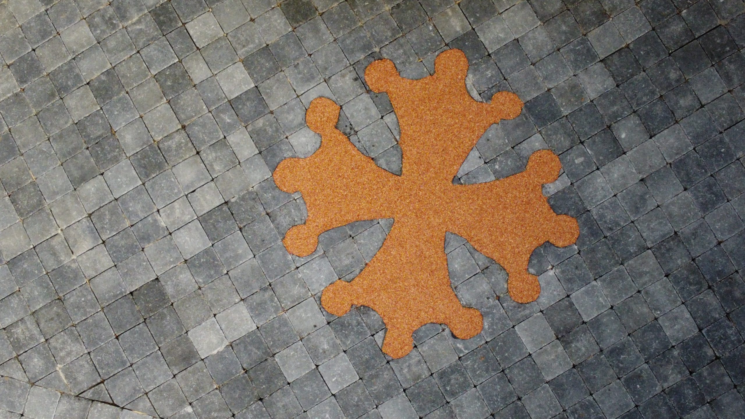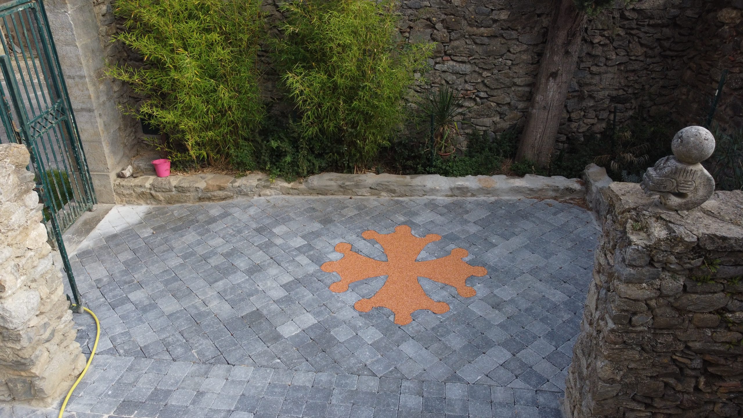 Plus agréable aussi, le pavage de grès qui permet d’aller de l’escalier à la grille sans patauger dans la gadoue…et le châtelain qui l’a installé a eu l’heureuse idée d’y incruster une superbe croix occitane.